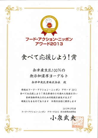「会津の雪ヨーグルト」が「食べて応援しよう!賞」を受賞致しました。